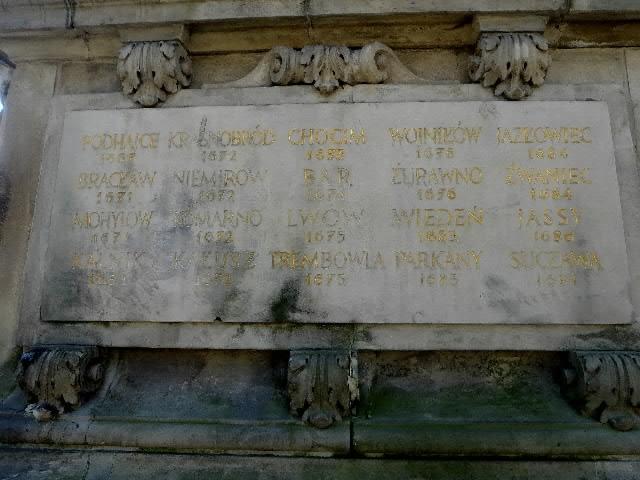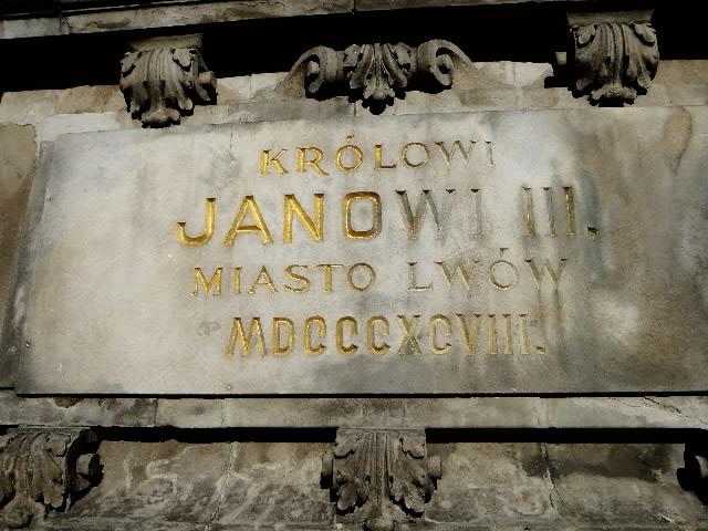 >Na cokole pomnika zamontowano 2 tablice. Na jednej widniał napis: „Królowi Janowi III Miasto Lwów MDCCCXCVIII”, na pamiątkę faktu, że rzeźbę ufundowali mieszkańcy miasta. Na drugiej wyryto miejsca najważniejszych bitew zwycięskiego wodza.