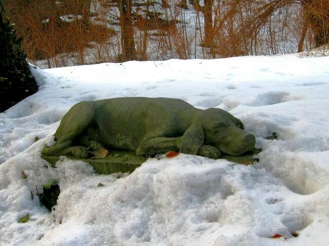Powód jest prosty. Statuetka leżącego psa usytuowana jest trochę na uboczu, poza utartymi trasami spacerowymi.