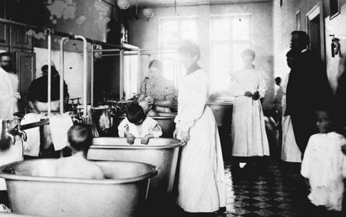 Ciekawostką jest obiekt, w którym wykonano pierwsze z poniższych zdjęć, przedstawiające kąpiel dzieci w wannach, widoczny też na dwóch kolejnych zdjęciach (zdj. nr 3 - współczesne).