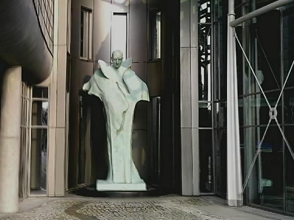 Na warszawskim Mokotowie, przy głównym wejściu do nowej siedziby TVP, od strony ulicy Samochodowej, stoi ponad dwumetrowej wielkości metalowy posąg, połyskujący zielonkawo w promieniach słońca.