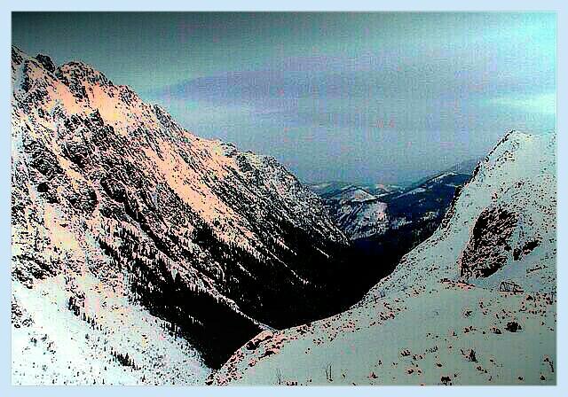 Wyszliśmy już całkiem z regla, wierzchołki jarzębin i smreków chwiały się nisko w dole. Stanęliśmy teraz na zupełnie otwartej przestrzeni i poczuliśmy pierwsze silne podmuchy wiatru. Duło całkiem zdrowo. Szliśmy mocno pochyleni do przodu, by nie dać się przewrócić. Mroźny wiatr ściął górną warstwę śniegu i zbocze zaczęło przypominać tor saneczkowy. Wywrotka groziła tu niekontrolowanym ślizgiem w dół po stoku aż do dna doliny i kąpielą w lodowatym strumieniu, połączoną z niemiłą akupresurą na jego kamieniach.