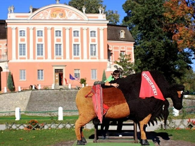 > odrestaurowany pałac Popielów w Kurozwękach i stadnina bizonów.