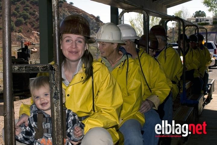 Na wstępie naszej wyprawy dostaliśmy żółte, gumowane kurtki których znaczenie było bardziej symboliczne i psychologiczne niż ochronne gdyż mieliśmy raczej ograniczone możliwości rzeczywistego utytłania się chyba że komuś przyszłoby do głowy tarzać się po dnie podziemnych tuneli. Następnym etapem było założenie grubego, skórzanego pasa i przytroczenie wielkiego akumlatora do którego, na elastycznym, długim na metr przewodzie przymocowany był górniczy reflektor. Tak wyekwipowani zajeliśmy miesca w jednym z wagoników wąskotorowej kolejki specjalnie zmodyfikowanej dla potrzeb przemysłu turystycznego. Jeszcze chwila a wypełnione promieniami słonecznymi przedpołudnie zamieniło się w klaustrofobiczny ciemny tunel z cherlawym oświetleniem u powały na które składały się, rozmieszczone w prawdziwie oszczędnych odstępach, zakurzone, niskowatowe lampki. Miało to zapewne odzwierciedlać warunki panujące w kopalni w czasie kiedy prosperowała przynosząc miliony dolarów jej właścicielom. Kolebiąca sie kolejka zawlokła nas do pierwszego postoju gdzie odkryto przed nami tajniki górniczego rzemiosła.